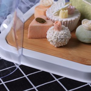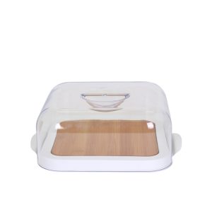 Flat round serving board comes with glass dome featuring ball top for easy handling.